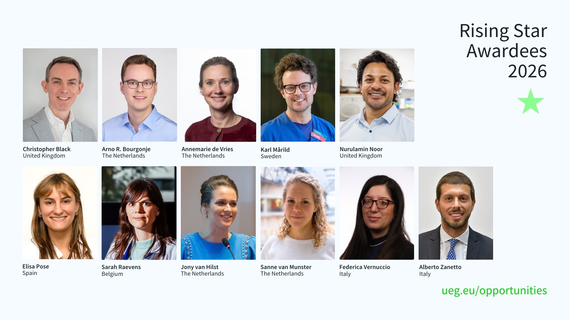 Selected Rising Stars 2026 will receive their award on occasion of UEG Week 2026. The Rising Star status includes the following invitations and benefits: